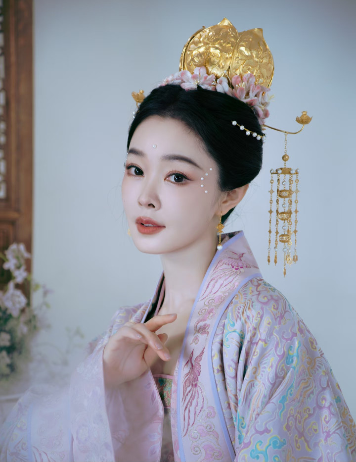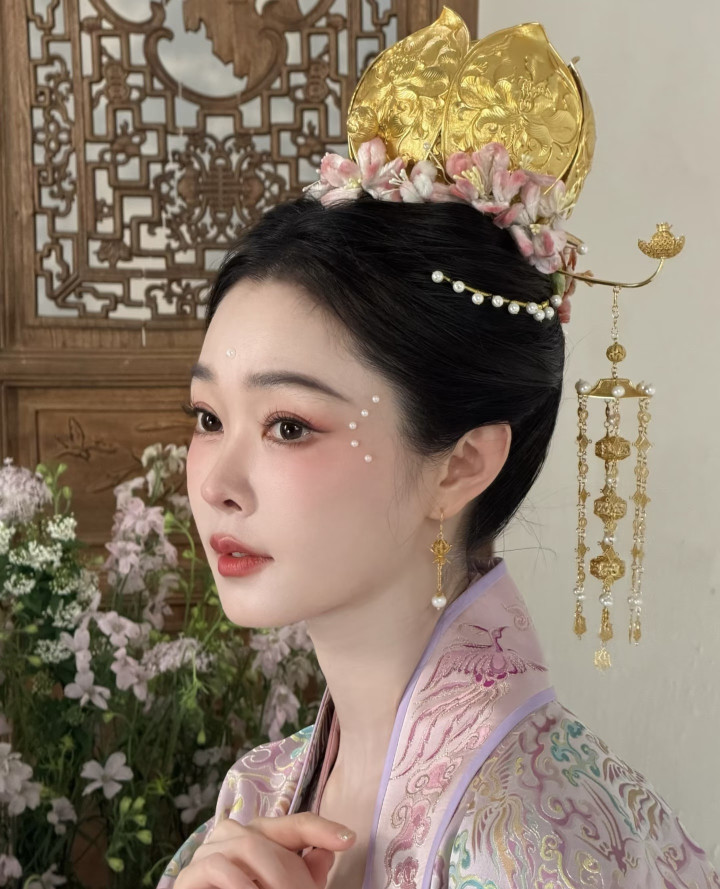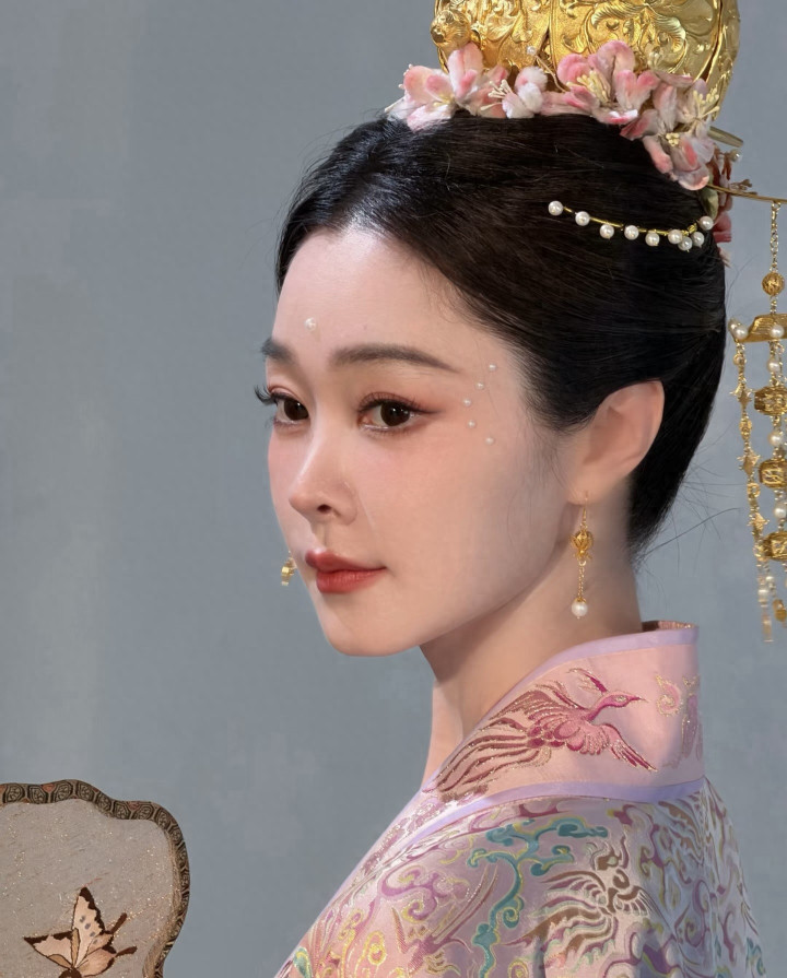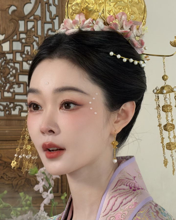 这个妆叫宋韵珍珠妆,宋代好意思女在眉心和面颊用珍珠代替花钿点缀妆面,宋轶白里透红的皮肤,以及温婉素雅的气质,很好的解说了这个造型,尽显东方之好意思,眼波流转睥睨生姿,一坐一都皆动东谈主。