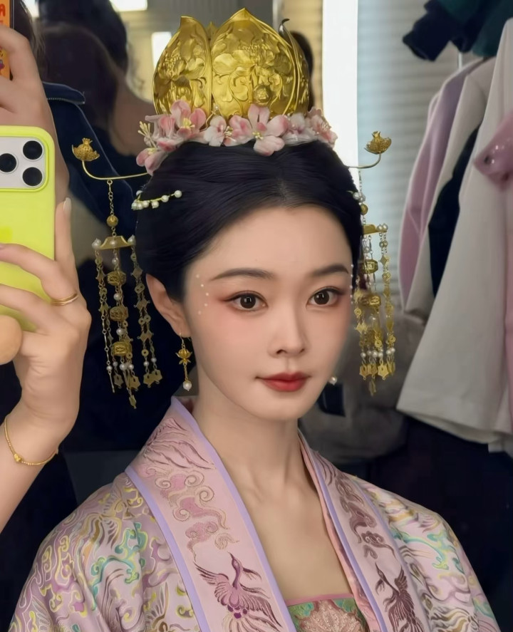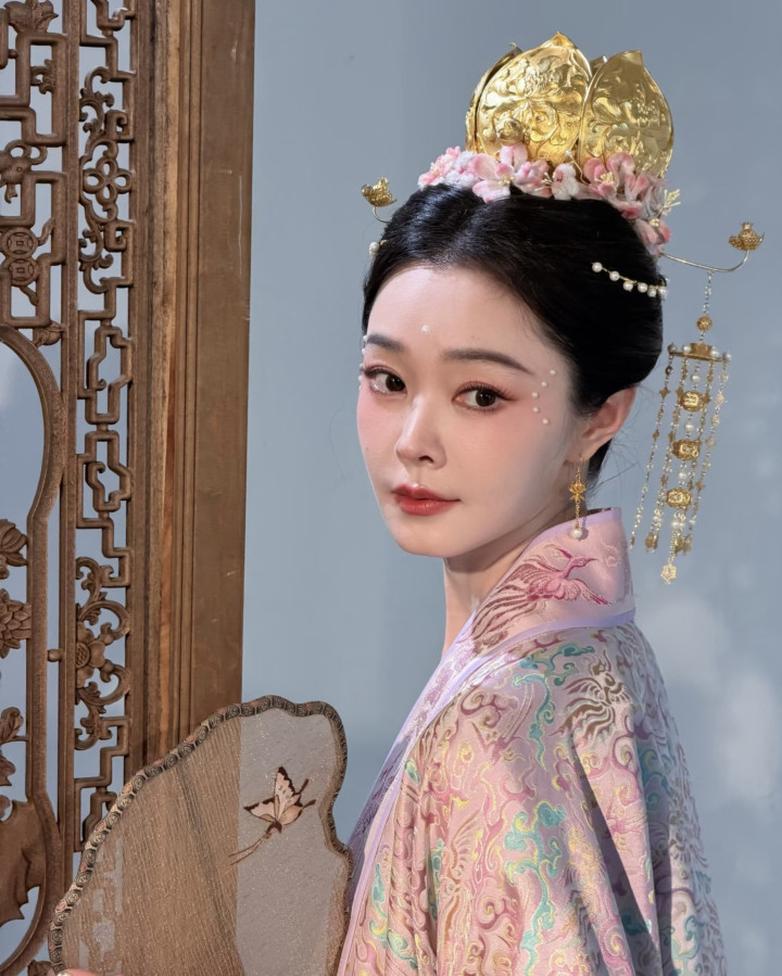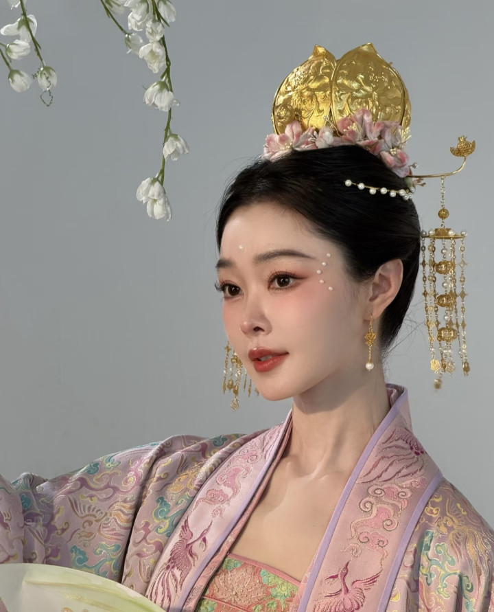 宋轶发髻中央戴着一顶金色的莲花冠,皇冠的周围簪一圈粉白色的桃花,两侧的长柄发簪金光灿灿流苏摇曳,宋轶的静态像片段然很好意思,她若是走起来“步步生莲”这个词就会具象化。