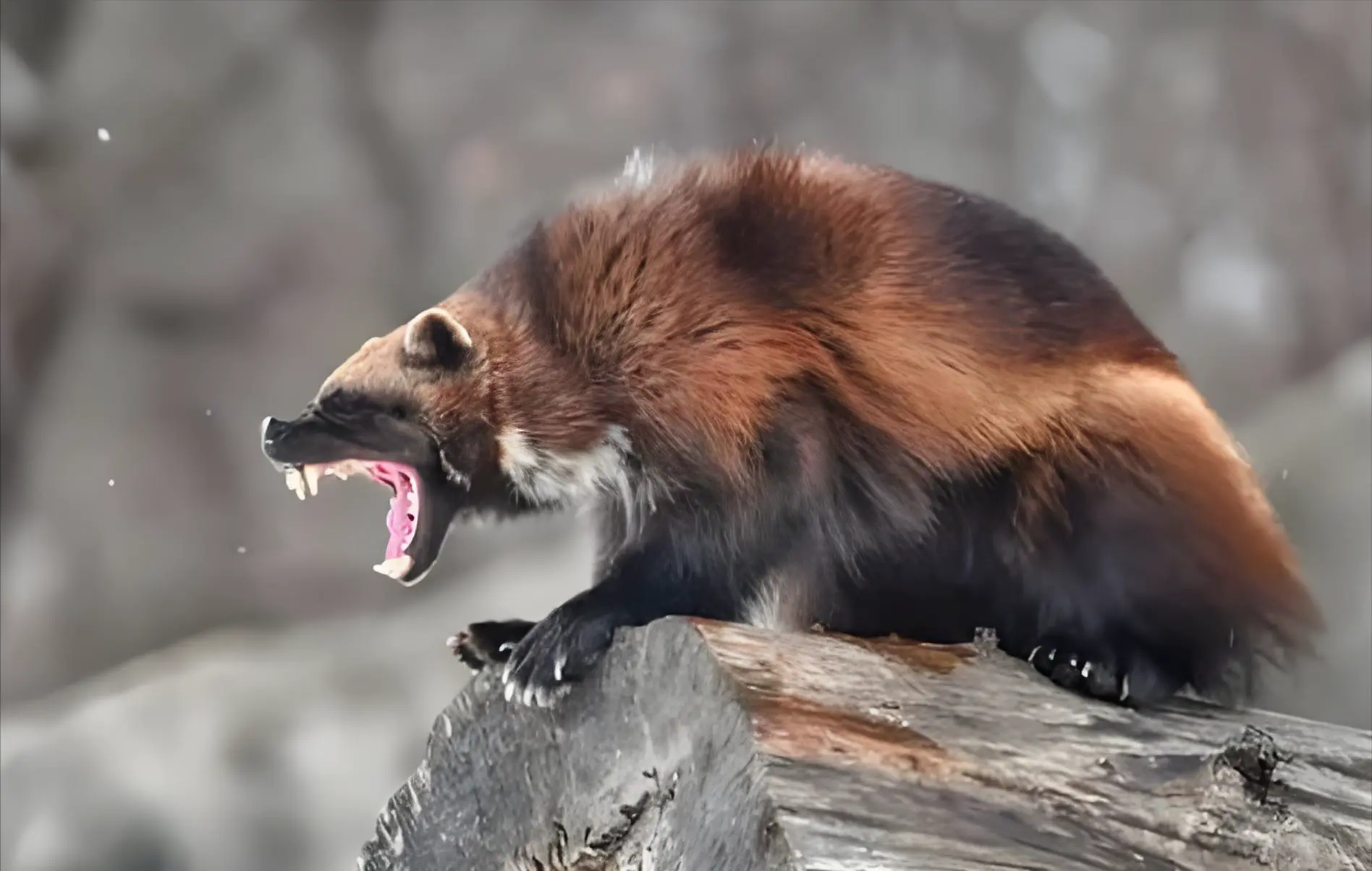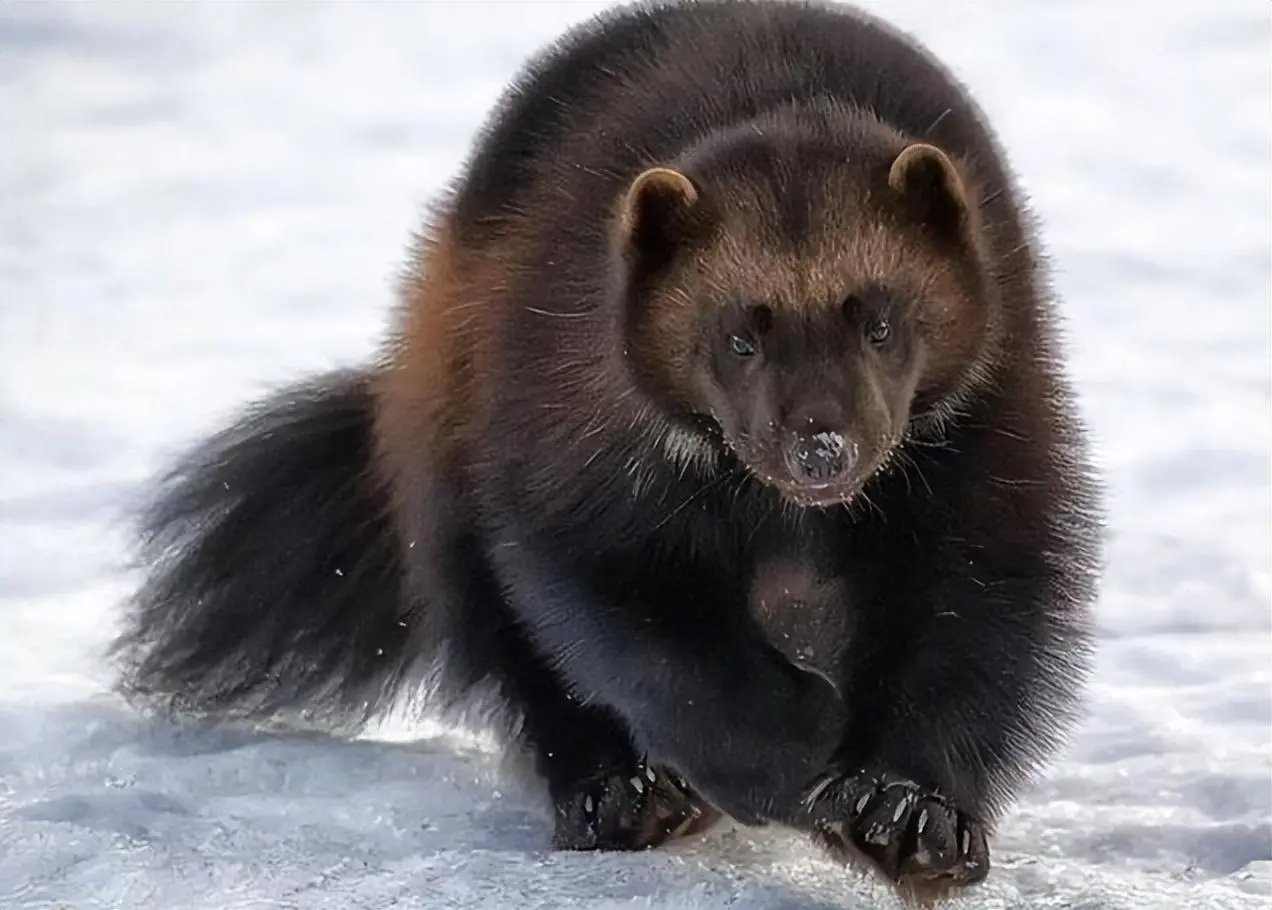 狼獾的“恶魔”标签,当先刻在它的躯壳构造上,这家伙看着不大,体长不外一米露面,缩在雪地里像团黑褐色的毛球,两侧还镶着黄褐色带状纹路,活像系了条破旧皮带。