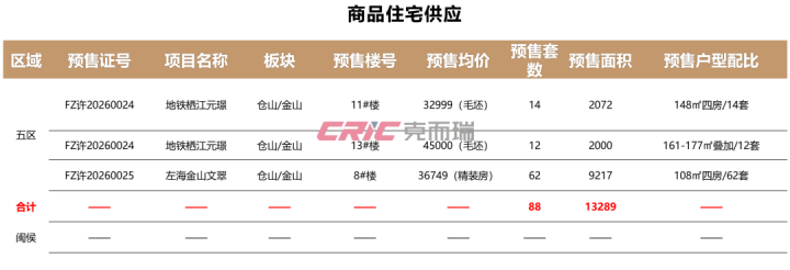 上周,福州五区商品住宅2个模式获得预售证,整个88套,供应面积约1.33万㎡;闽侯商品住宅无供应。