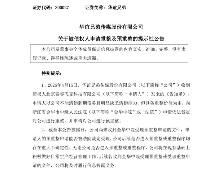 4月15日,华谊手足传媒股份有限公司(华谊手足,300027.SZ)公告,当日,公司收到债权东说念主北京泰睿飞克科技有限公司(以下简称“请求东说念主”)发来的《奉告函》,请求东说念主以公司不成反璧到期债务且昭着短少反璧智力,但具备重整价值为由,向浙江省金华市中级东说念主民法院(以下简称“金华中院”或“法院”)请求照章裁定对公司进行重整,并请求对公司进行预重整。