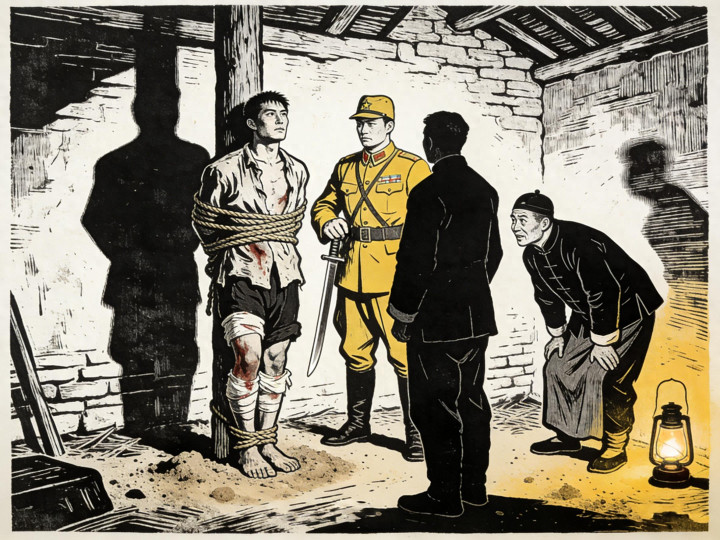 几个鬼子猛扑上来,拧胳背压腿,把他顿时捆了个踏实,随后推搡着,把他弄进了炮楼下面的一间黑房子里。