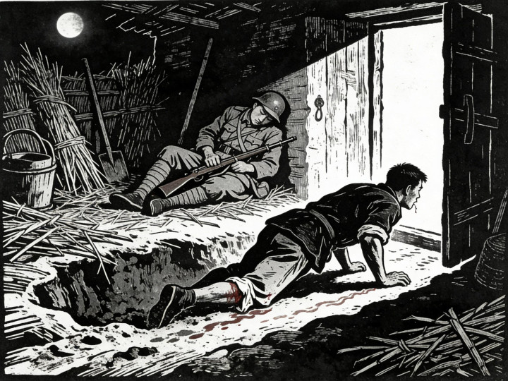屋里头黑下来了,外头的风呜呜地吹。那伪军守了半宿,困劲儿上来了,脑袋少许少许的,跟鸡啄米似的。
