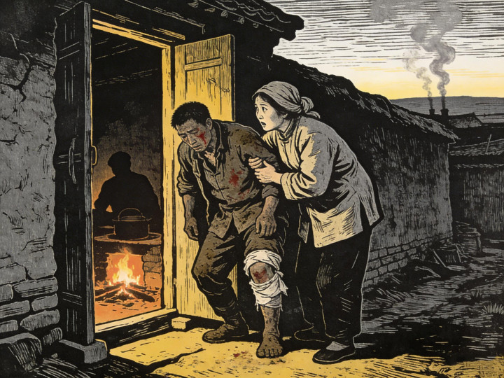 他爬了也不知说念多久,天快亮的手艺,总算摸到了一户东说念主家后墙根。他趴在地上,伸手敲了敲那扇破木板门。
