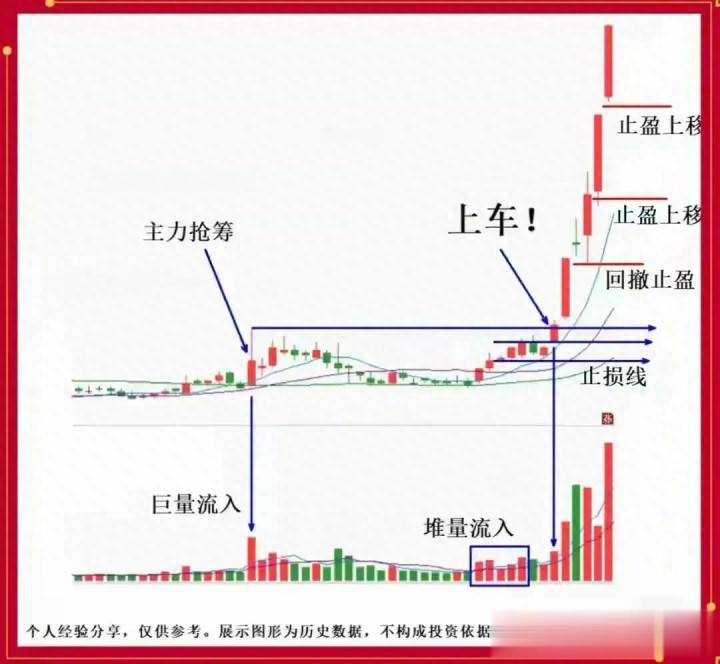 这个阶段完成后,经常会出现一个“暴量启动”——一根放量大阳线突破横盘区间,量能比前边横盘期间的日均量放大了两到三倍,这便是典型的抢筹信号。