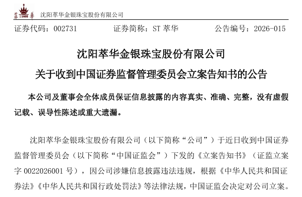 ST萃华(002731)2月9日晚间公告,公司于近日收到中国证券监督照顾委员会(简称“中国证监会”)下发的《立案奉告书》,因公司涉嫌信息泄露违警非法,把柄《中华东谈主民共和国证券法》《中华东谈主民共和国行政处罚法》等法律法例,中国证监会决定对公司立案。
