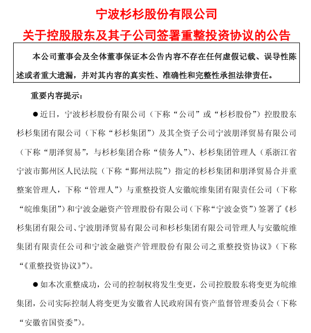 2月8日,杉杉股份发布公告称,控股股东杉杉集团过甚全资子公司宁波一又泽交易有限公司(以下简称“一又泽交易”)、杉杉集团管制东说念主,与重整投资东说念主皖维集团、宁波金融金钱管制股份有限公司(以下简称“宁波金资”)签署《重整投资合同》。若后续重整要领到手完成,公司控股股东将变更为皖维集团,现实规定东说念主将相应变更为安徽省国资委。