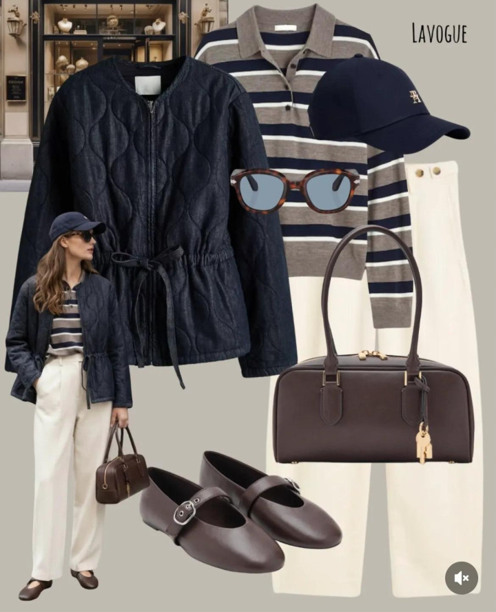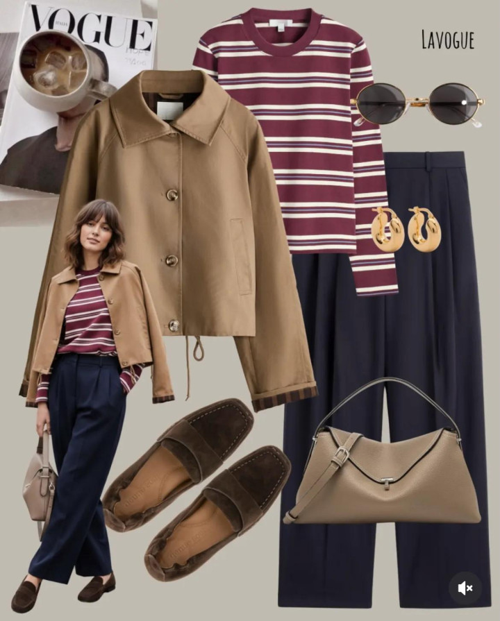 小羊皮短夹克一穿就有显赫的嗅觉,不外棕色系会容易显暮气,用红白条纹T恤一搭,就多了几分轩敞感,再穿双轻巧的绒面平底鞋,有种圭臬感的优雅。