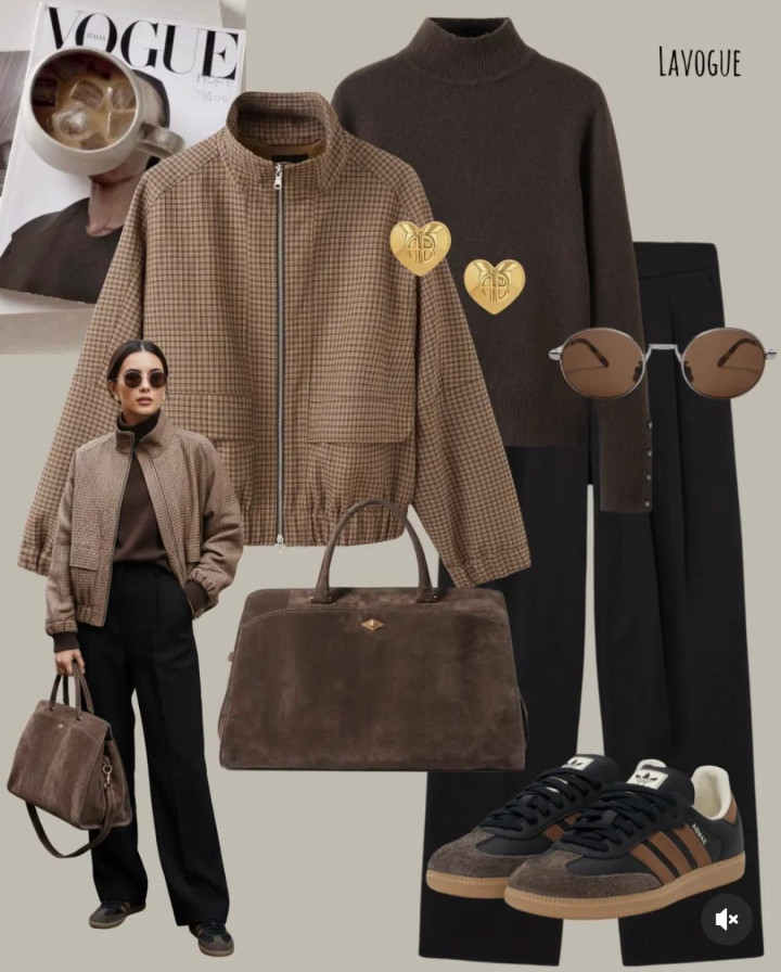 细跟小格纹与咖色的搭配总能穿出作风感。立领小夹克穿得很帅气。搭条垂坠感很好搭西裤,穿出修身好比例。
